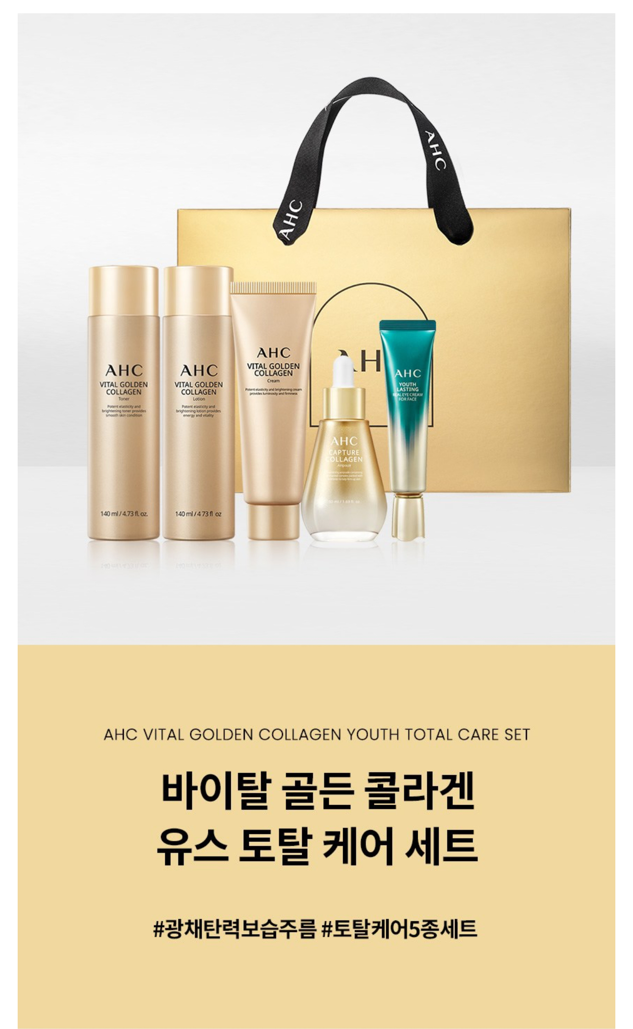 AHC 골든 콜라겐 유스 토탈 케어 세트 | 콜라겐 | 피부 탄력 개선, 보습, 윤기 부여 | 피부 탄력 강화, 풍부한 보습감 | 가격이 다소 높음, 트러블 가능성 |